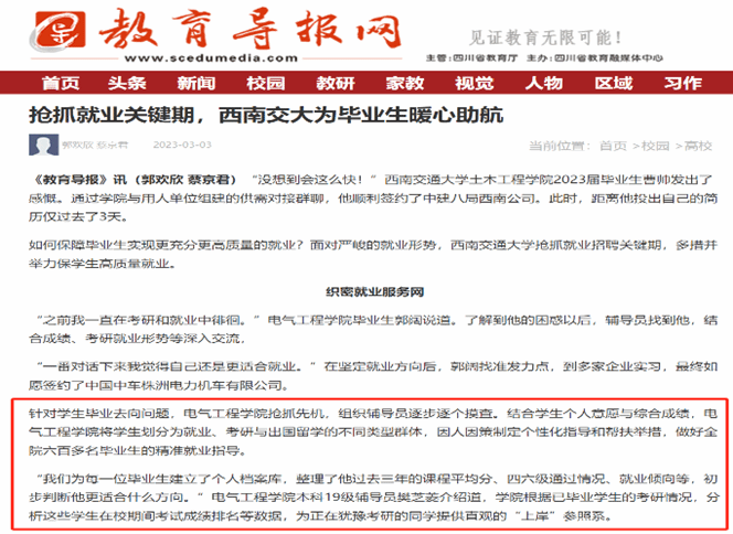 扎实的就业工作取得了突出的工作成效,公司在2023年就业考核中获评一等奖,就业工作在《教育导报网》、四川新闻联播《稳就业·一线调查》等媒体报道, 樊芝菱也先后三次获“beats365亚洲版官网就业工作先进个人(综合奖)”荣誉称号。