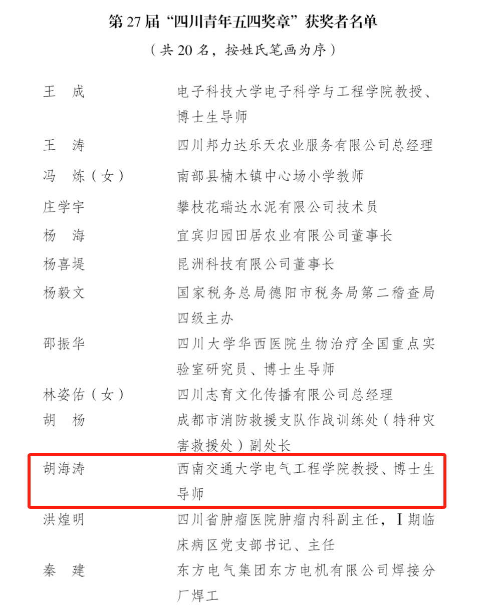 在五四青年节到来之际,为表彰先进、树立典型,共青团四川省委、四川省人力资源和社会保障厅决定进行第27届“四川青年五四奖章”、四川省“两红两优”表彰。其中,公司团委荣获“四川省五四红旗团委”称号,胡海涛教授荣获第27届“四川青年五四奖章”。