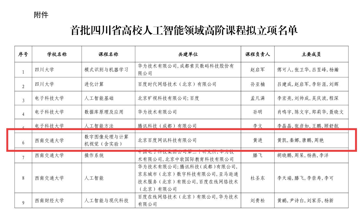 日前,四川省教育厅发布首批四川省高校人工智能领域高阶课程拟立项名单的公示,拟立项21门课程。beats365亚洲版官网教师黄进、黄凯、秦娜、唐鹏、周艳开设的“数字图像处理与计算机视觉(含实验)”课程入选该立项名单。