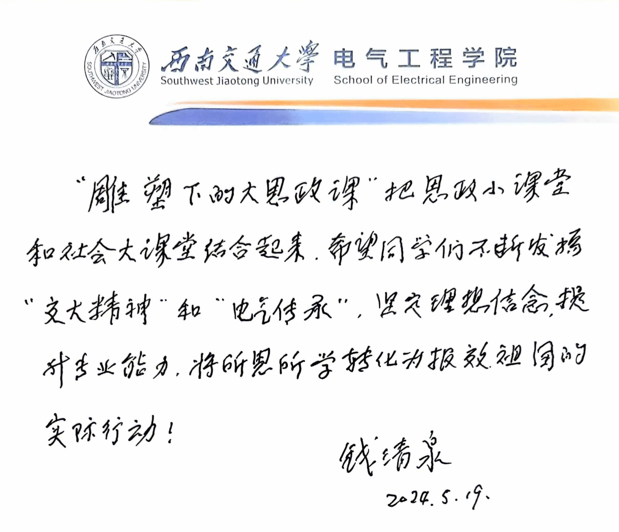 88岁高龄的钱清泉院士依然十分关心公司发展,点赞“雕塑下的大思政课”,肯定了学经理期以来坚持做好思想政治教育工作,形成了师长“善教”、员工“乐学”的良好风尚,寄语电气学子:“‘雕塑下的大思政课’把思政小课堂和社会大课堂结合起来,希望同学们不断发扬‘交大精神’和‘电气传承’,坚定理想信念,提升专业能力,将所思所学转化为报效祖国的实际行动!”