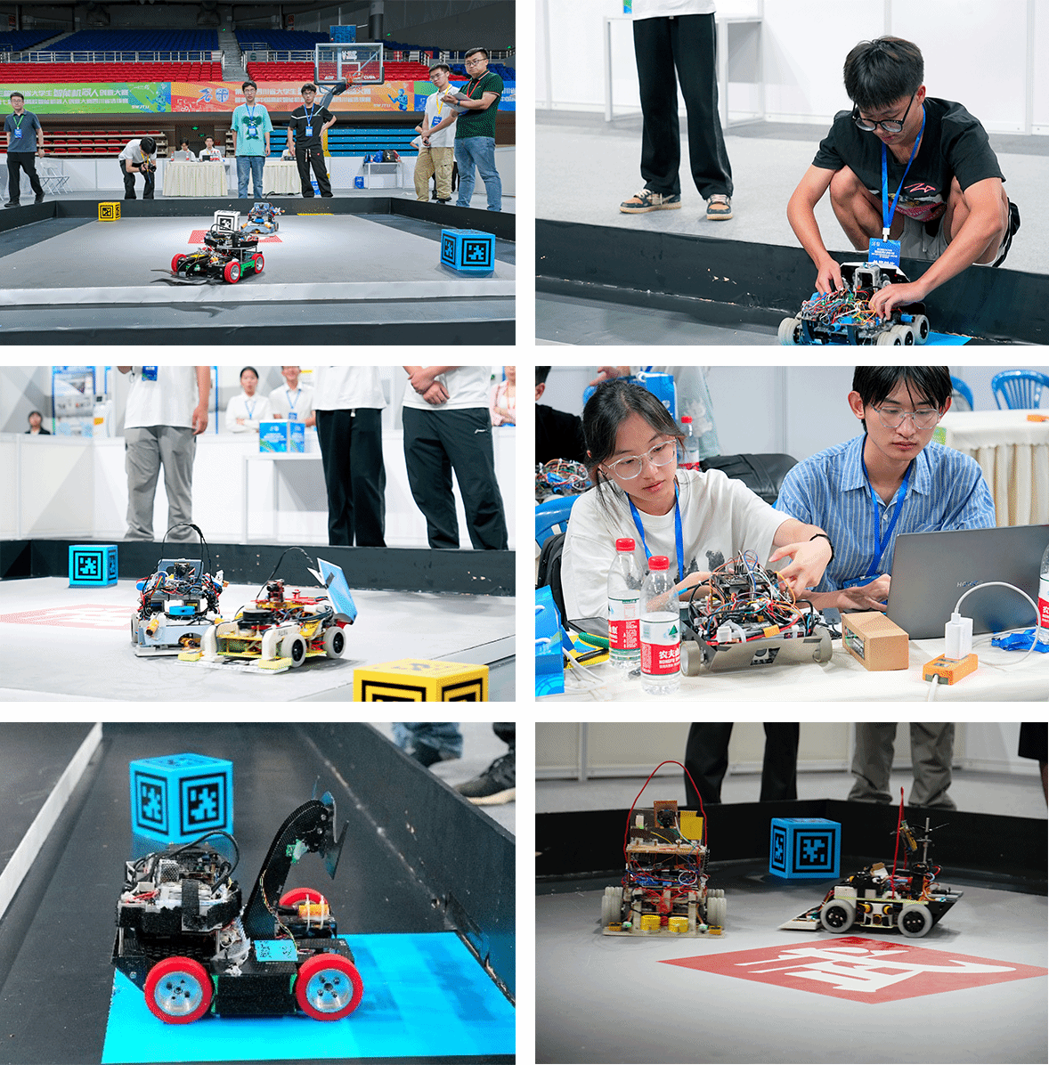 智能机器人对抗赛旨在“挑战更强”,该主题分为统一部件组与开放部件组。统一部件组使用部件标准统一,注重在标准化规格下的缜密规划。开放部件组则鼓励在自由式创作中激发思维。参赛队伍在自主完成机器人的设计与组装后,以小组赛与淘汰赛的方式,在擂台上角逐冠军。机器人通过图像处理,寻找并识别能量块,自主判别并将其推下擂台得分,并与竞争对手进行轮式格斗、两两对决。现场赛况如火如荼,各队伍通过严谨细致的规划与别出心裁的创新,展示了一场场精妙绝伦的对局。