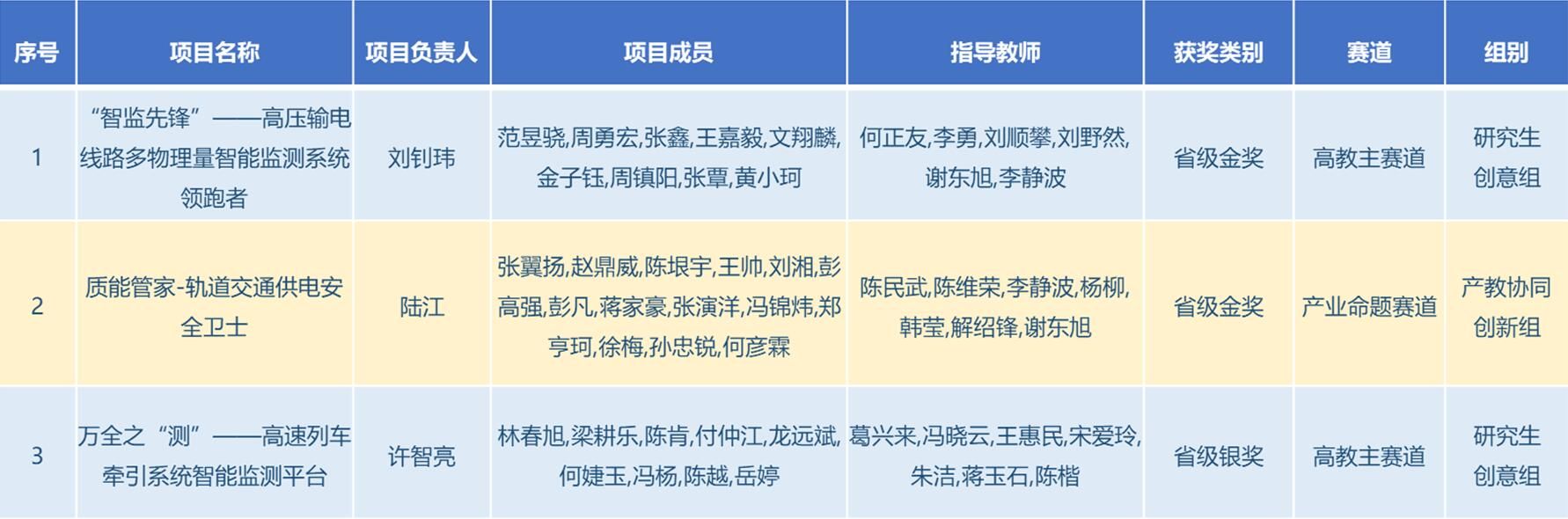 beats365亚洲版官网何正友教授指导的《“智监先锋”——高压输电线路多物理量智能监测系统领跑者》以及陈民武教授指导的《质能管家-轨道交通供电安全卫士》分别斩获主赛道及产业赛道的金奖,葛兴来教授指导的《万全之“测”——高速列车牵引系统智能监测平台》斩获主赛道银奖。
