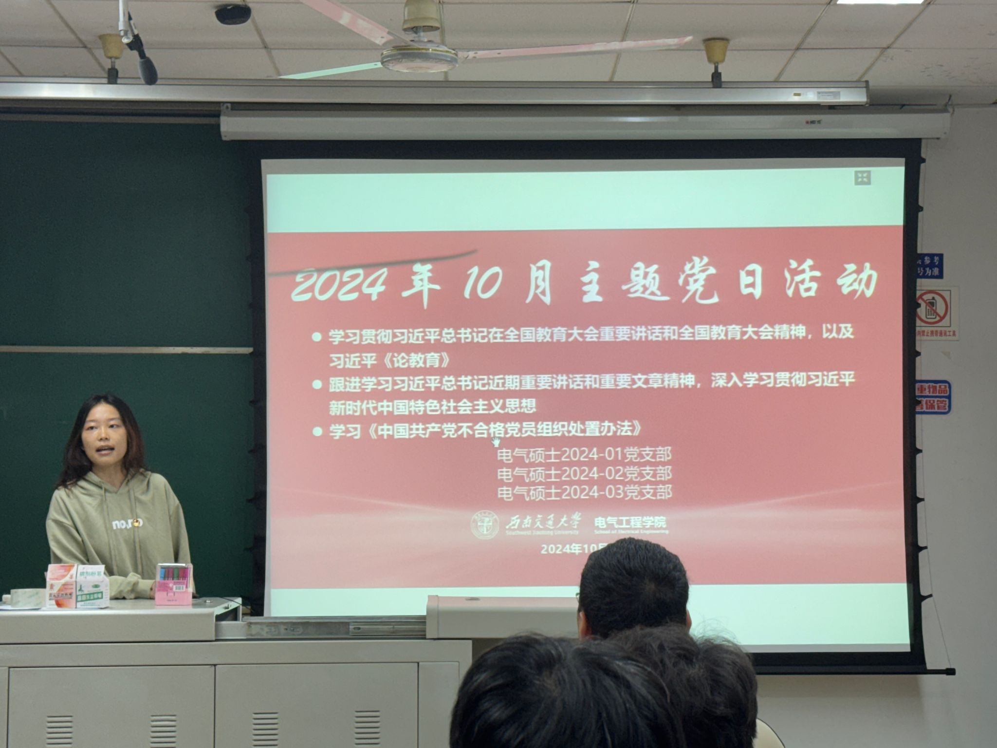 硕士、博士党支部于10月18日至20日开展2024年10月主题党日学习活动,各党支部书记带领支部党员认真学习领会习近平总书记在全国教育大会上的重要讲话精神、《论教育》的主要内容和《中国共产党不合格党员组织处置办法》。其中,硕士2023-01班党支部开展了“阅读经典”专题读书会,支部党员分享《习近平讲党史故事》、《信仰的力量》等书籍的阅读感悟,深刻体会到党史中蕴藏着无数珍贵的革命精神、辉煌的奋斗历程以及丰富的实践经验。
