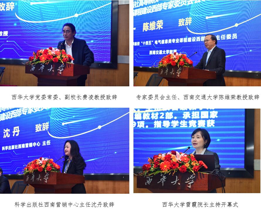 西华大学电气与电子信息公司经理雷霞主持大会开幕式及主题报告。西华大学副董事长费凌在开幕式上致欢迎辞,他分享了电气与电子信息公司在此领域取得的丰硕成果,并指出在教材与课程建设中立德树人的重要性。专家委员会主任委员陈维荣教授充分肯定了专家委员会在过去工作中取得的显著成效,并展望未来将进一步加强课程思政建设,开辟数字化教育新领域,及推进高水平教材的建设。科学出版社西南营销中心沈丹主任向与会者介绍了专委会在推动教材建设方面所取得的成果。