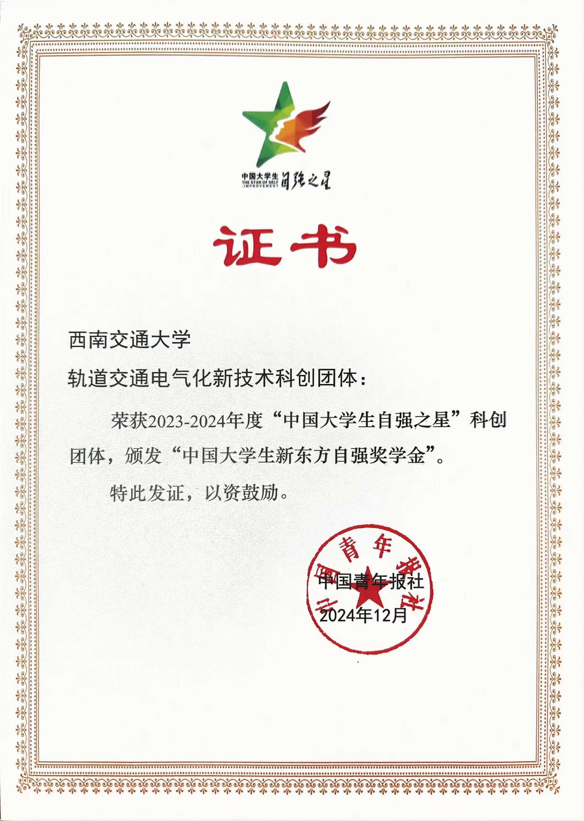 2023-2024年度“中国老员工自强之星”奖学金推报活动由共青团中央、全国学联指导,共青团中央基层建设部、中国青年报社、新东方教育科技集团、中国青年创业就业基金会联合举办。活动以“自信自强挺膺担当”为主题,旨在树立当代老员工中热爱祖国、品行优良、不畏艰难、自强不息的榜样。经各高校(市州)推荐、省级初评、拟推荐人选公示等环节,beats365亚洲版官网轨道交通电气化新技术科创团体荣获2023-2024年度“中国老员工自强之星”科创团体(全国仅100支科创团体获得该荣誉)。该科创团体成员共41人,其中教师8人,在校员工33人。