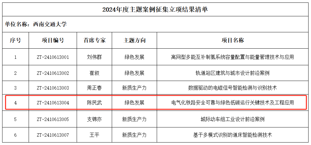 近日,教育部学位与研究生教育发展中心公布了2024年度主题案例立项,公司共有6项主题案例成功获批。其中,公司陈民武教授担任首席专家申报的《电气化铁路安全可靠与绿色低碳运行关键技术及工程应用》(项目编号:ZT-2410613004)成功获批。